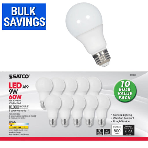 View full detailsSatco S11400 9W A19 LED Bulb, E26 Base, 3000K, 10-Pack