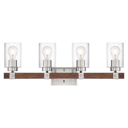 NuvoFeatures Finish: Brushed Nickel / Nutmeg Wood Material: Steel, Glass, Wood Shade: Clear Seeded Glass Voltage: 120V Dimensions: 28.25" W x 10" H...
