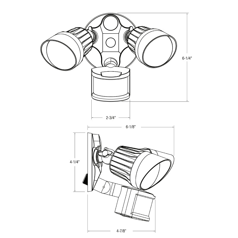 Dual adjustable light heads, flexible, wide distribution. Sturdy die-cast aluminum housing. 360 degrees rotation. LEDs create efficient floodlight illumination.
