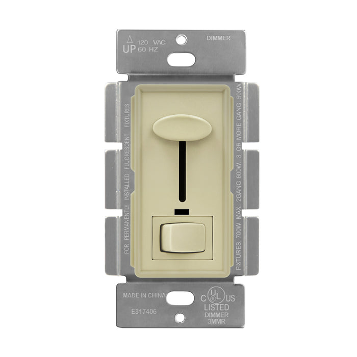 The 50321 dimmer switch is used for 120V incandescent light bulbs. The dimmer switch features a vertical slider for brightness controls and a mini paddle switch to turn lights ON/OFF at any time. This switch can be installed in either single pole or three-way applications.