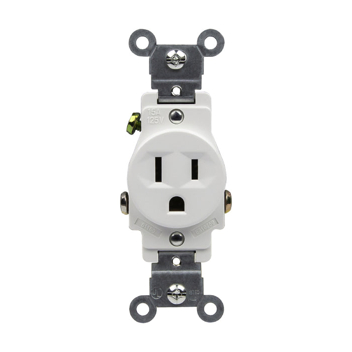 Enerlites' Commercial Grade Receptacles are rated for variety of standard configuration. This single tamper resistant receptacle is equipped with break-off plaster ears and tabs to allow for easy alignment All receptacles designed with thermoplastic construction and feature a shallow build for maximum wiring room.