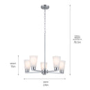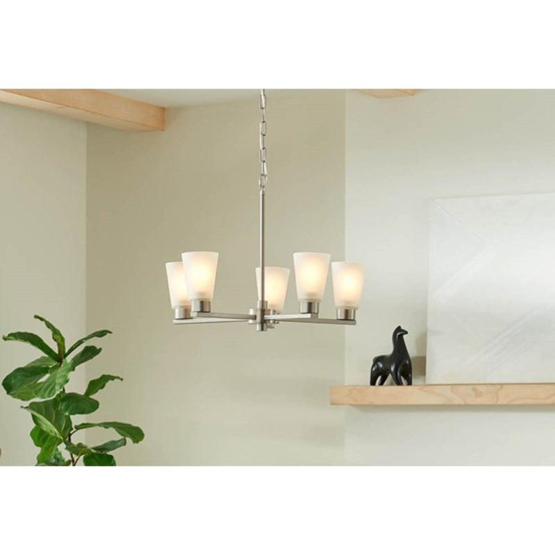 The Stamos 24" 5 Light Chandelier adds a soft modern touch. Its Satin Etched Glass shades softly add dimension, while its Black / Brushed Nickel / Olde Bronze finish keeps it modern. Install the lights facing up or down to effortlessly make the Stamos chandelier work for your space.