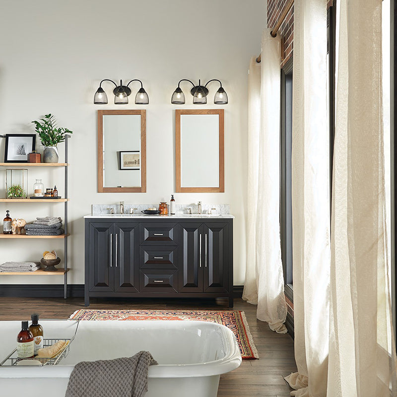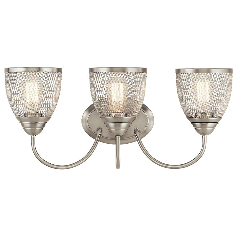 The Voclain™ 3 light vanity light features a distinctive industrial look with its metal mesh shade.