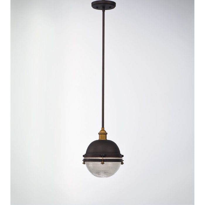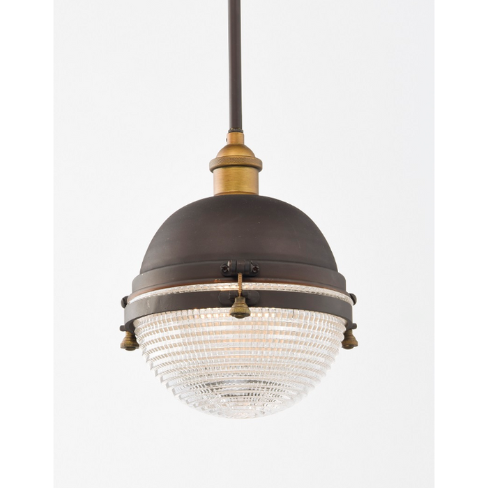 This nautical design features a solid dome of aluminum finished in Oil Rubbed Bronze with solid brass hardware finished in Antique Brass. The Clear prismatic glass diffuser completes the authentic look of this outdoor collection.