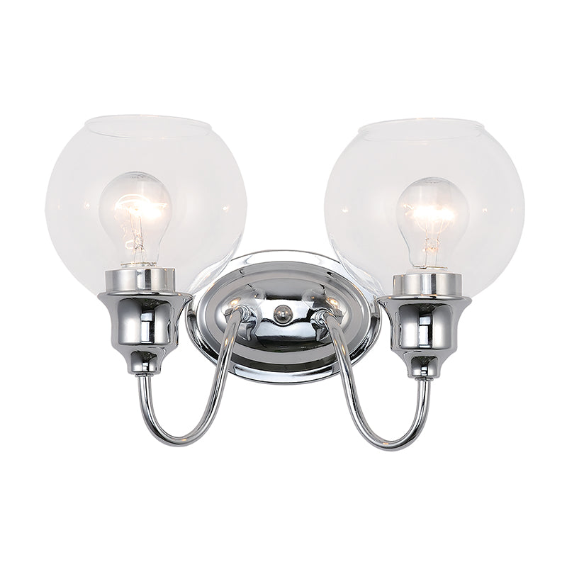 Curved arms support circular glass with an open bottom which can be installed facing up or down. Available in your choice of Polished Chrome with Clear glass or Satin Nickel with Satin White glass.
