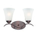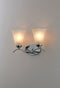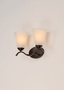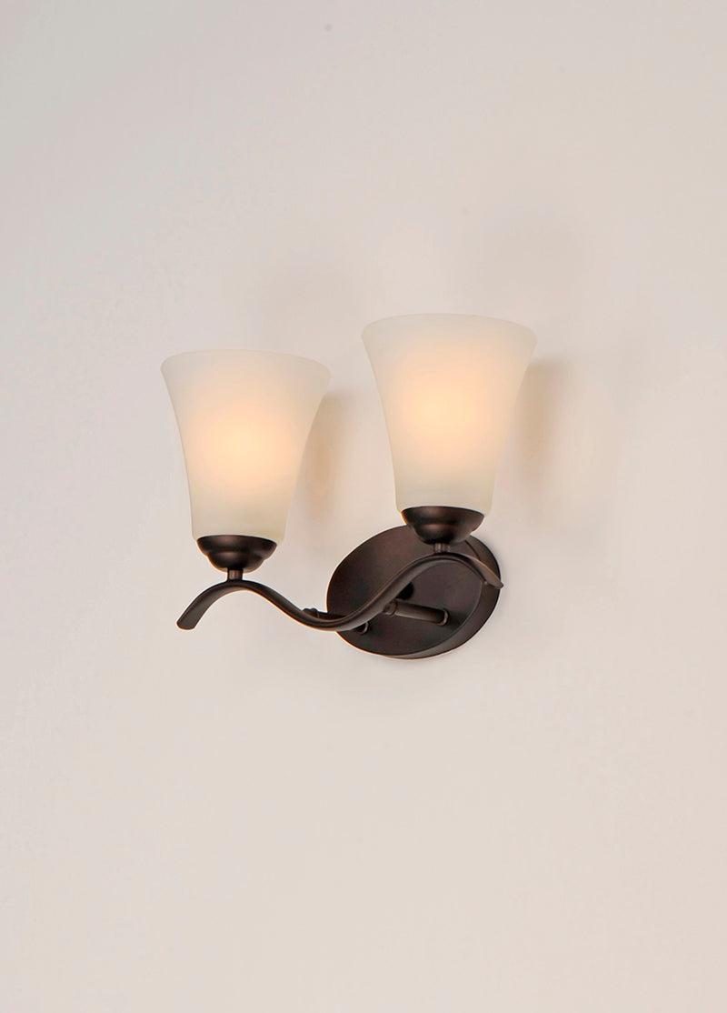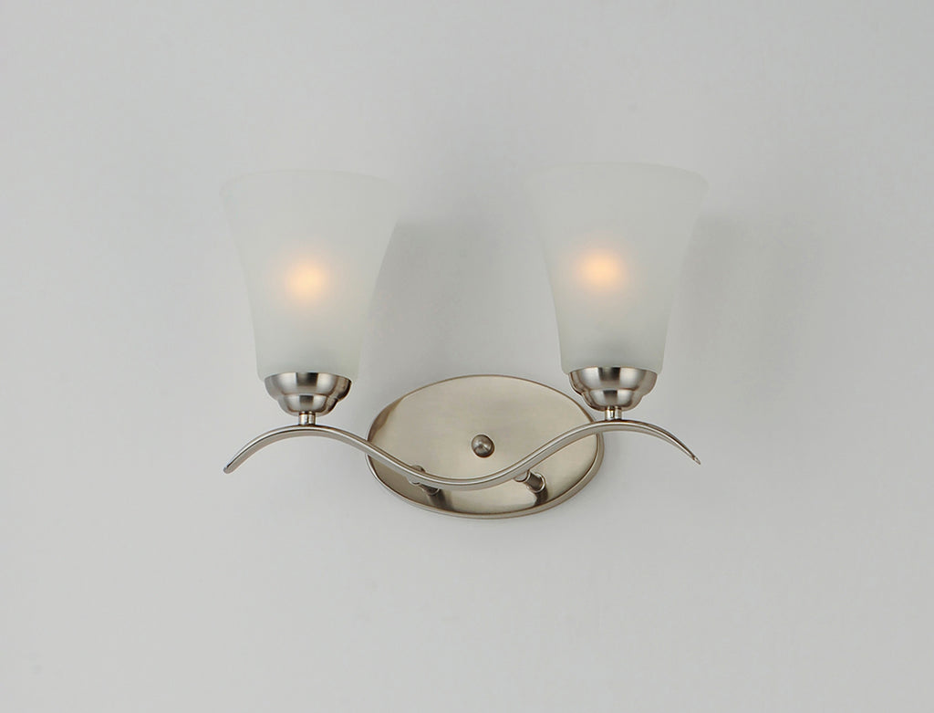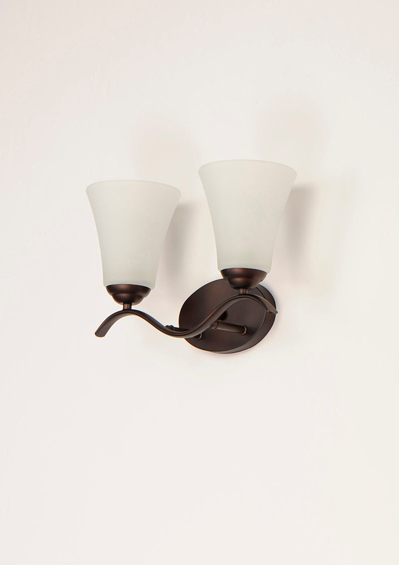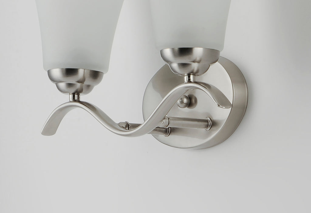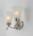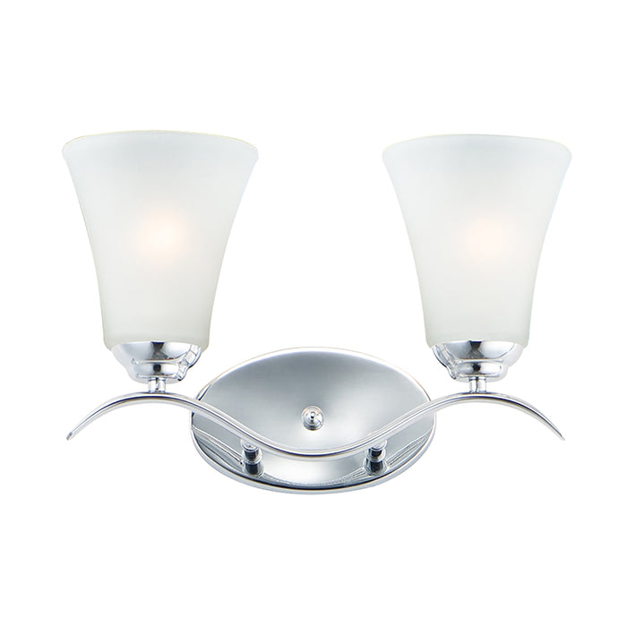 Gently waving arms of Satin Nickel or Oil Rubbed Bronze support tall-profile Frosted glass shades creating a scale normally not found in this category of lighting. The bath vanity may be installed up or down and also includes a Polished Chrome finish.