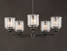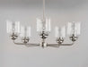 A modest frame of steel tubing gently bends to support a cluster of Clear Seedy bell-shaped glass. Similarly the bobeches and other metal accents echo that traditional bell shape creating an instant classic.