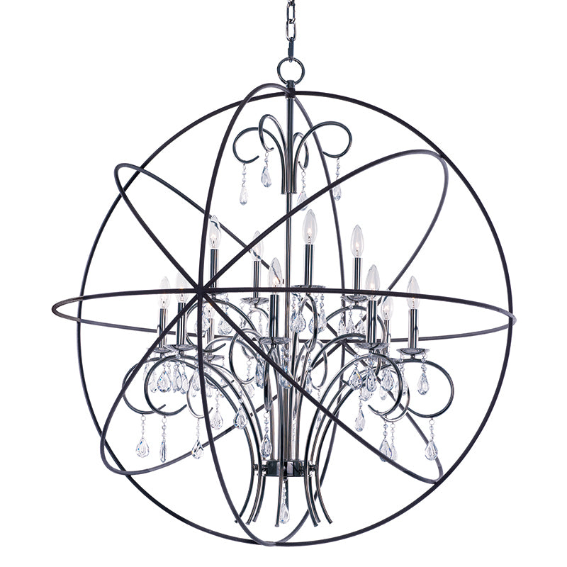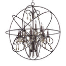 A spherical frame of metal surround a simple line chandelier draped in crystal for a transitional style that fits any interior design.