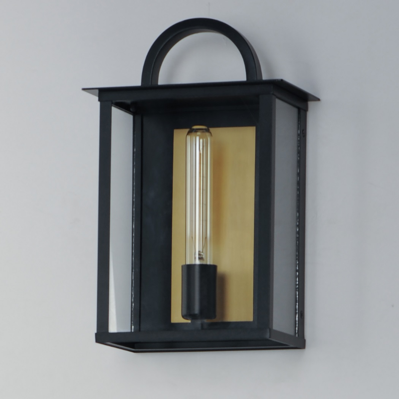 The Manchester series is inspired by classic coach lanterns and consists of minimally extended sconces in a variety of sizes that have been modified with simplified embellishments. The black frames have been modified with a squared arc handle and a contrasting Burnished Gold plate that reflects clusters of candle lights surrounded by Clear glass panels. This collection references historic exterior sconces while modernizing their appearance. Complement the design with tubular lamps to accentuate the verticality of the frames.